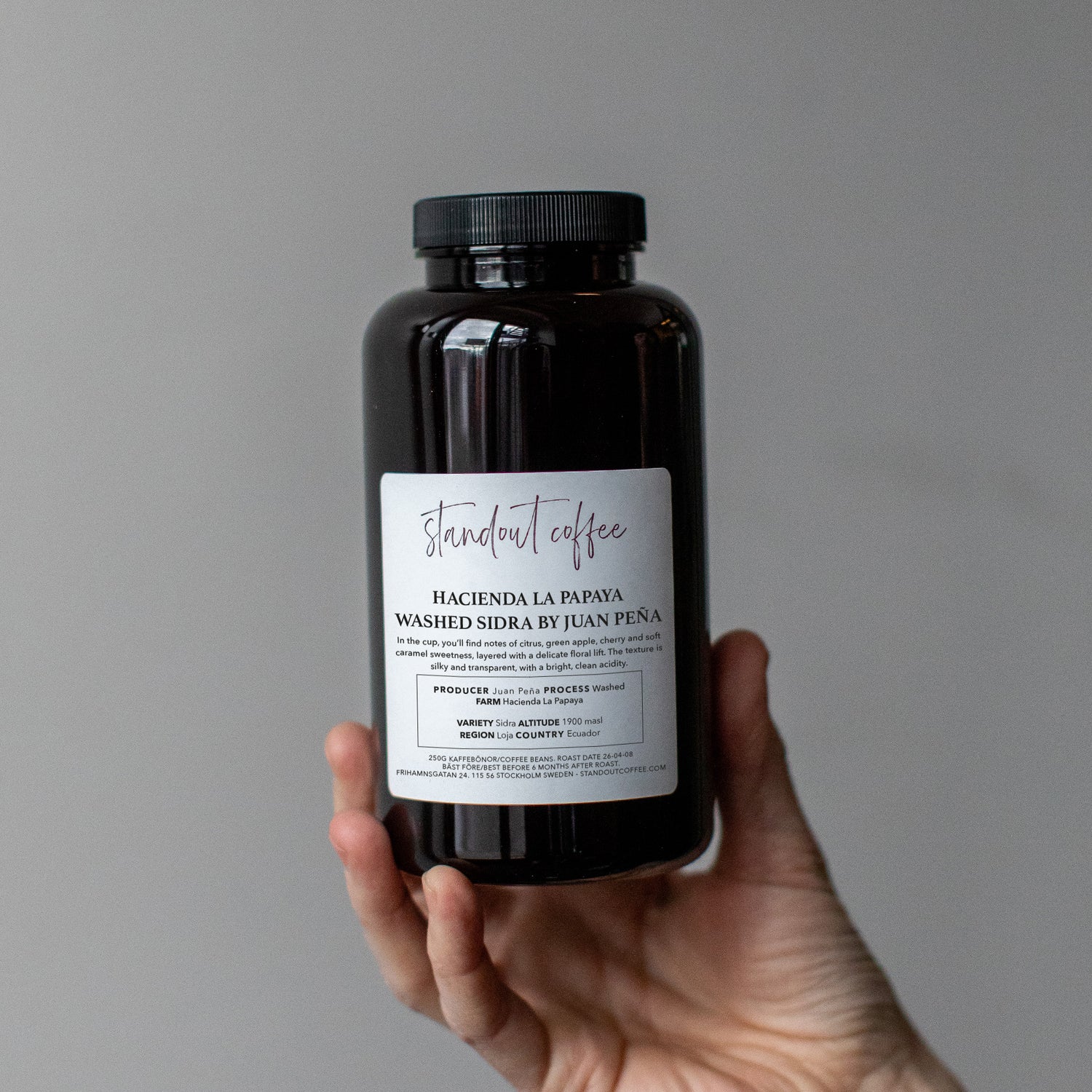 The Jar: Contains 250 grams of fresh roasted specialty coffee beans.